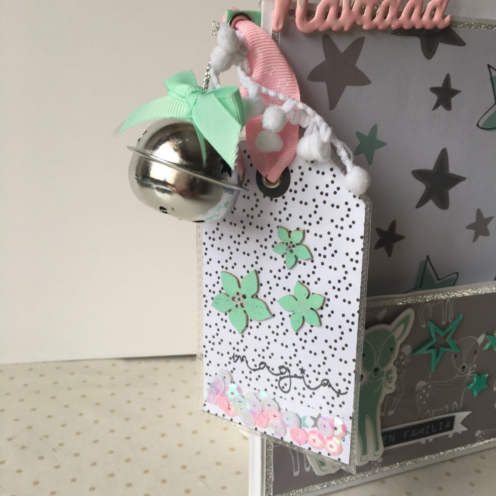 la portada que he plastificado he colocado un tassel que he hecho con lana, una palabra de foam de Ami Tangerine, y un lazo cortado con un troquel de Florileges que lo he pegado en una horquilla de pelo dorada.